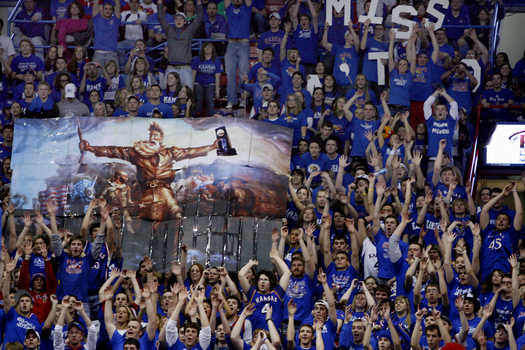 That’s a banner of John Brown holding the NCAA Championship Trophy. It’s a border war… and KU let Mizzou know the loss last month didn’t go unnoticed!