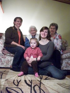 Five generations are alive in my family right now and it’s pretty special. My grandmother, Worldia Yarnell. My mother, Ruth Thompson. My sister, Mary Gaull. My niece, Amanda Spear. My great-niece, Caitlyn. What a joy!