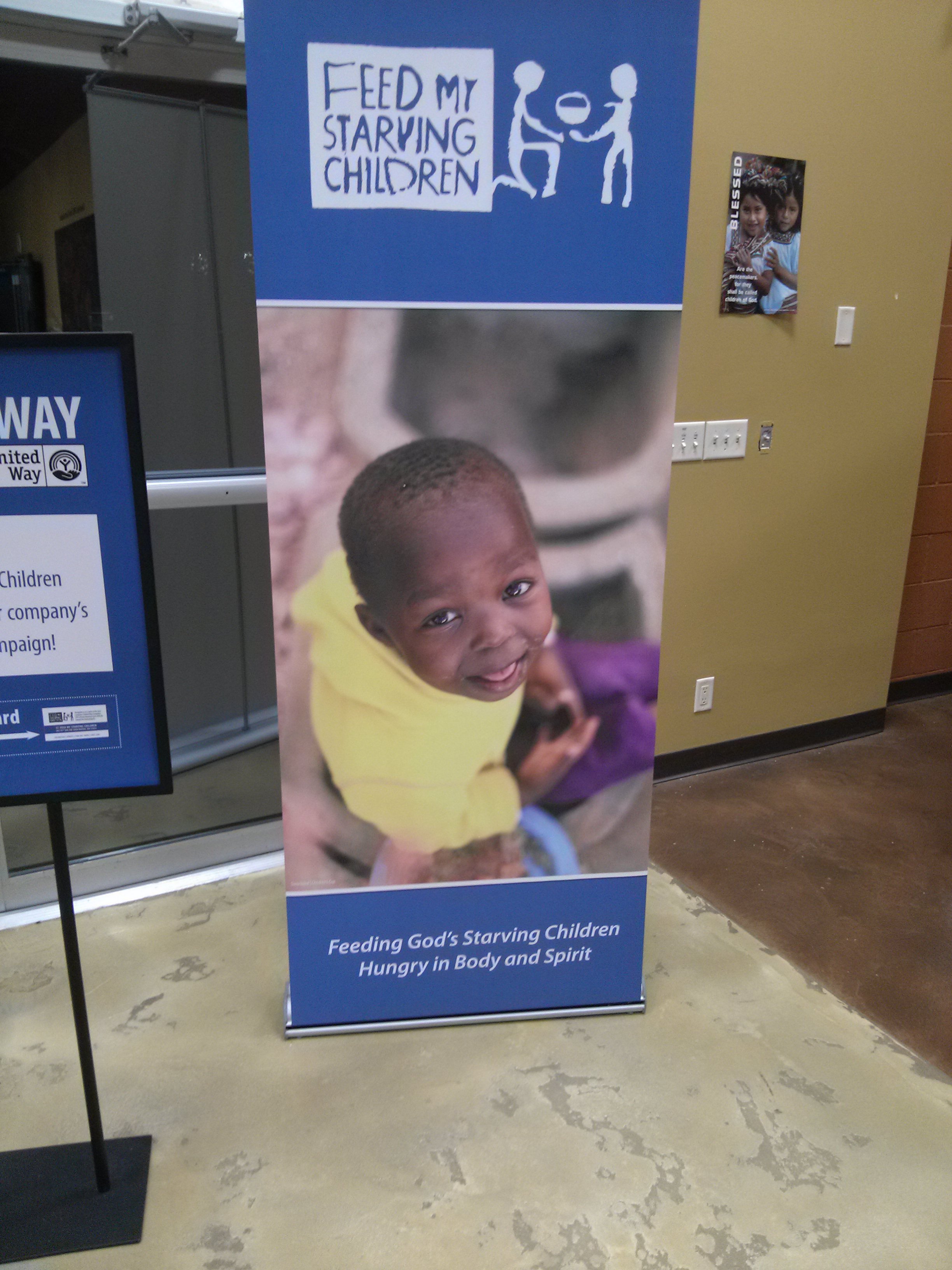 In the Twin Cities, this is a huge organization that gets hundreds of volunteers every day to come in and package the food. Last night, 25 of our church combined with several other groups to make a 1.5 hour shift of 114 volunteers. Each bag of food we prepped would provide 6 meals on average. Our shift packed 115 boxes. Each box contained 36 bags. If that were rationed out in the way Feed My Starving Children would prescribe, we fed 67 kids for a year with 1.5 hours of work.