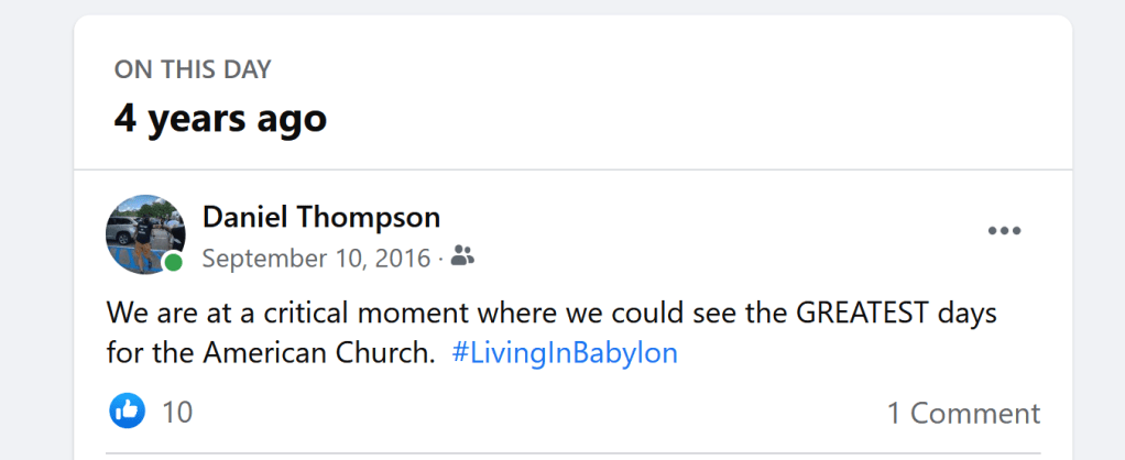 But I don’t think we’re learning our lesson. It may be a long time. Israel had to take a break in Babylon. I’m not sure what that means for the American Church. What I DO know is that four years ago this Facebook post was a big swing and a miss.