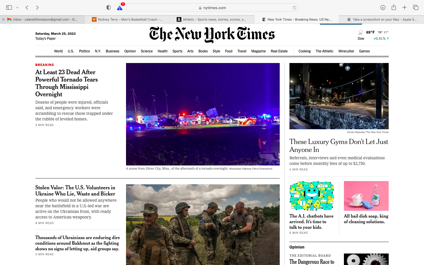 I couldn’t get over the contrast on the page of The New York Times when I went to their page today. The first thing that caught me was the breaking news story of the tornadoes that killed 23 people in Mississippi overnight. We woke up to pouring rain, so I was wondering how much we had dodged a bigger storm. Then, I looked up the counties where the tornadoes had hit. The story in the Times related that the very poor rural county had 20 percent of its residents below the federal poverty line and a huge percentage lived in mobile homes.